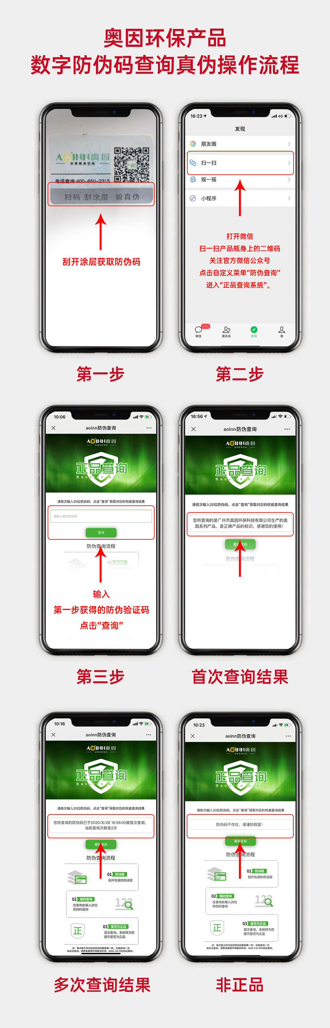 首先,關(guān)注奧因官方微信公眾號奧因環(huán)保;其次,在自定義菜單欄中找到“防偽查詢”,點擊即可進入三重防偽系統(tǒng),根據(jù)網(wǎng)頁提示輸入相關(guān)信息,即可獲得查詢結(jié)果。