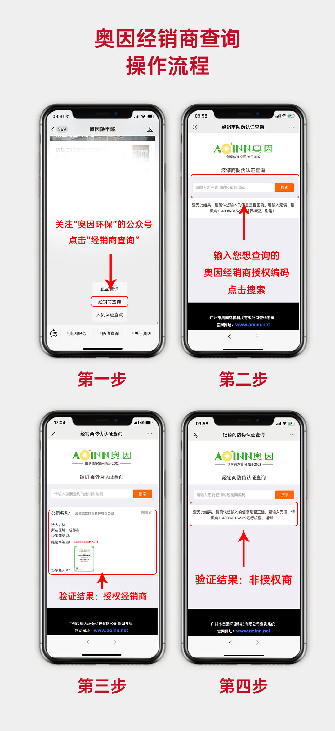在“奧因環(huán)保”的公眾號,點擊“經(jīng)銷商查詢”,輸入您想查詢的奧因經(jīng)銷商授權(quán)編碼。