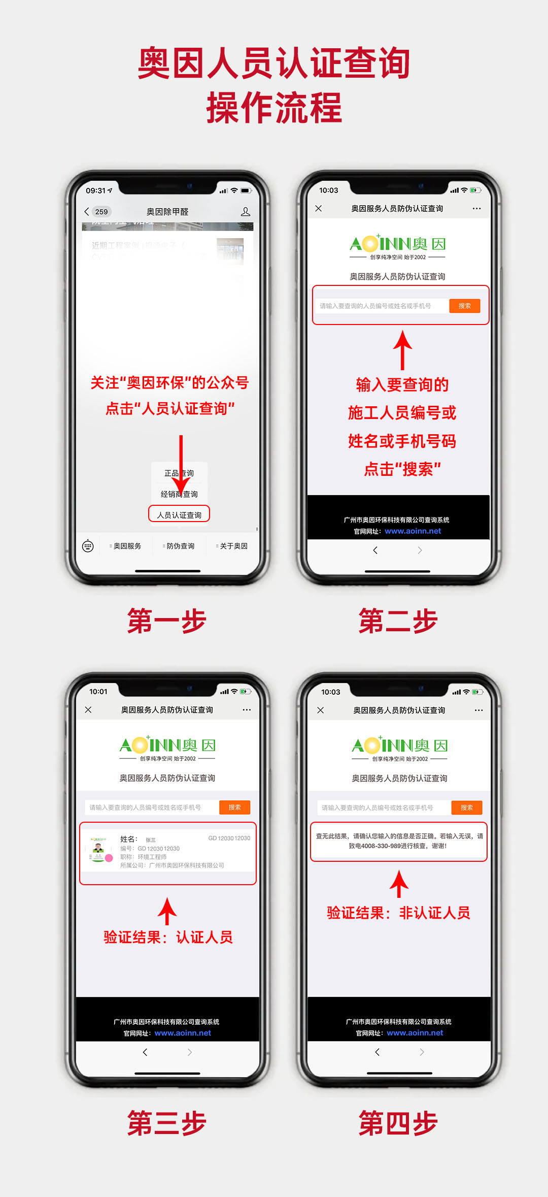 打開“奧因環(huán)保”微信公眾號的“人員認(rèn)證查詢”,輸入施工人員的姓名、手機號碼或施工證件編號,均可驗證施工人員是否為奧因認(rèn)證。